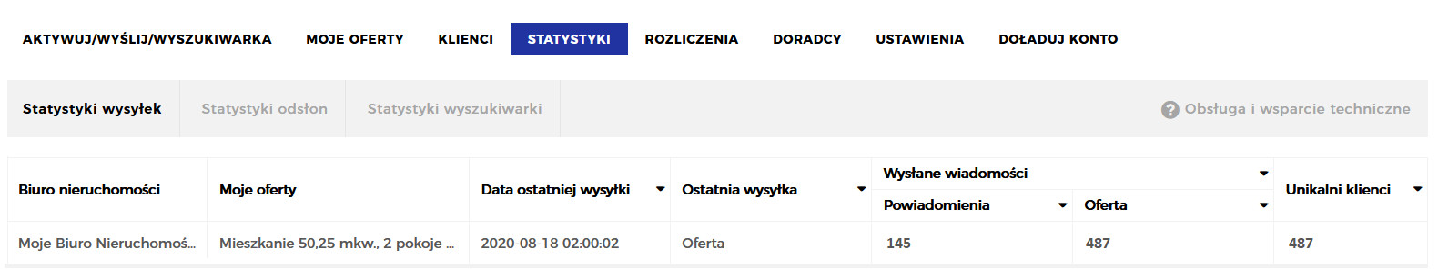 Dla każdej oferty, dla której dokonana została wysyłka, prezentowane są statystyki z datą oraz rodzajem ostatniej wysyłki (oferta/powiadomienie), liczbą wysłanych ofert/powiadomień, liczbą unikalnych klientów.