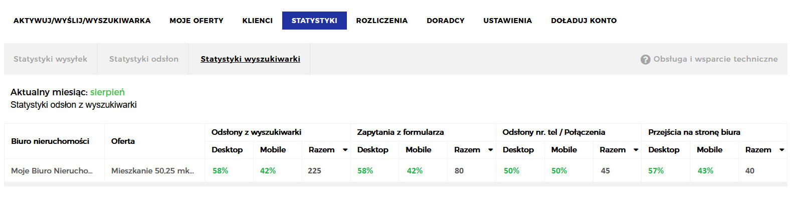 Dla każdej oferty, dla której dokonana została wysyłka ofert prezentowane są statystyki odsłon, zapytania z formularza, odsłony/wybrania numeru telefonu, przejścia na stronę biura nieruchomości. Wszystkie statystyki prezentowane są z podziałem na statystyki na komputery stacjonarne oraz smartfony.