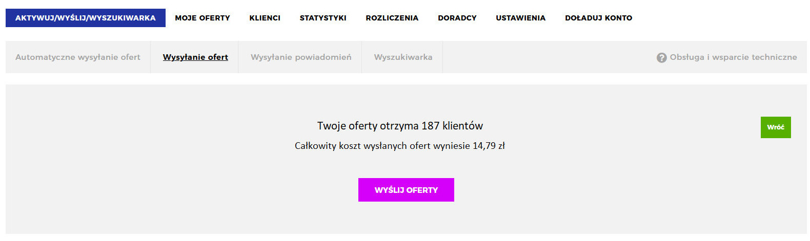 W przypadku manualnego wysyłania ofert i powiadomień, po dokonaniu ustawień w aplikacji, a przed dokonaniem wysyłki wyświetlany jest całkowity koszt wysyłki.