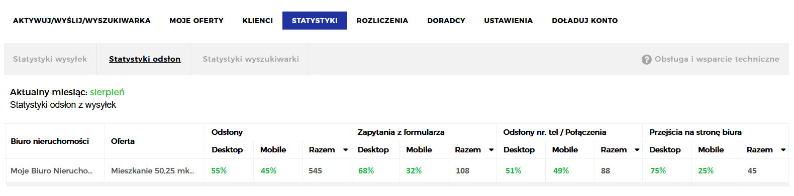 Dla każdej oferty, dla której dokonana została wysyłka ofert prezentowane są statystyki odsłon, zapytania z formularza, odsłony/wybrania numeru telefonu, przejścia na stronę biura nieruchomości. Wszystkie statystyki prezentowane są z podziałem na statystyki na komputery stacjonarne oraz smartfony.